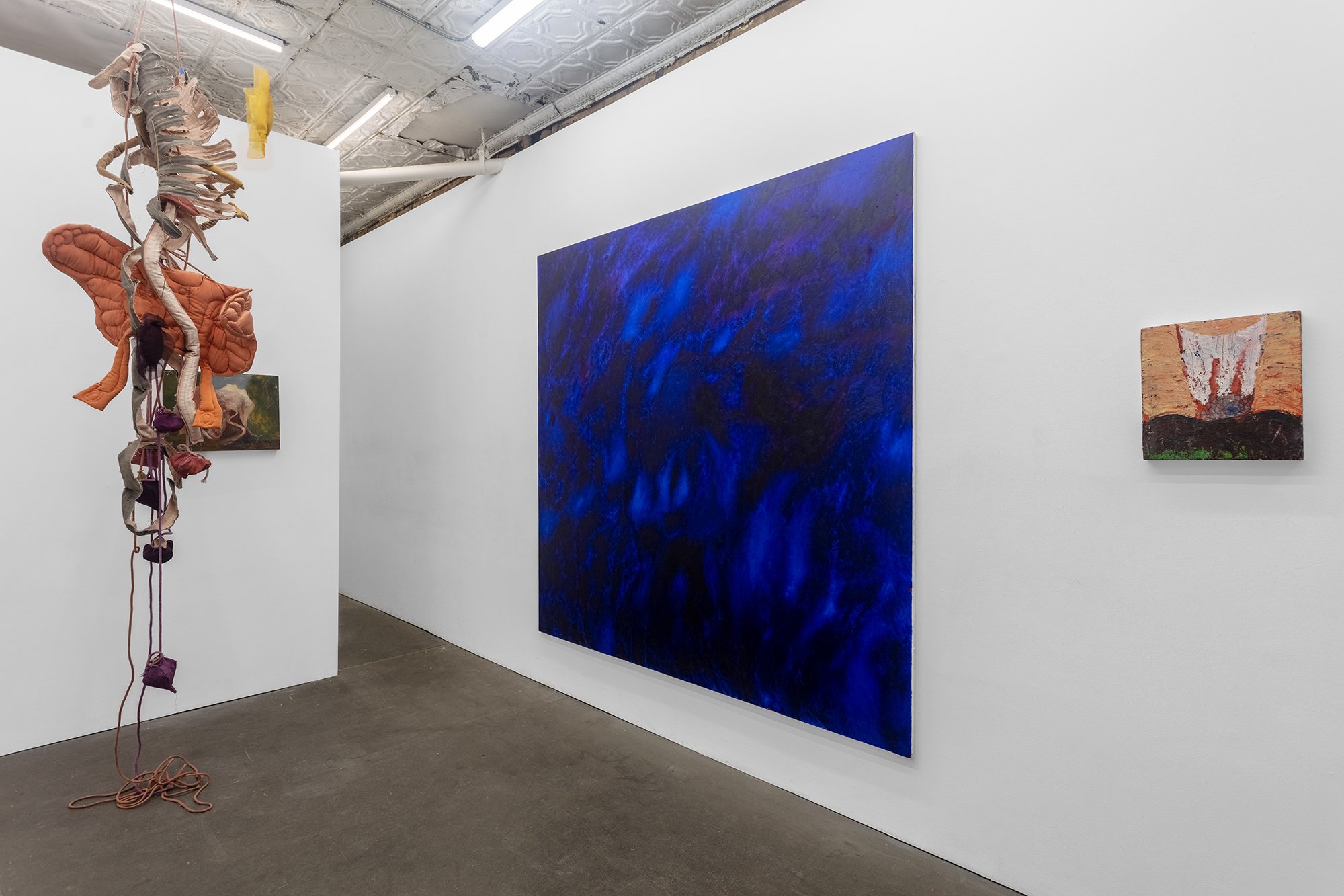 This January, Klaus von Nichtssagend will show three new sculptural works by Joy Curtis in the front gallery. Curtis uses hand-dyed fabrics inlaid with wire supports to create cavity-like forms alluding to bodies, skeletons, or armor. Their forms extend down from the walls to the floor in long strands. Within some of the fabric forms, bronze-cast objects hang suspended like talismans or organs.